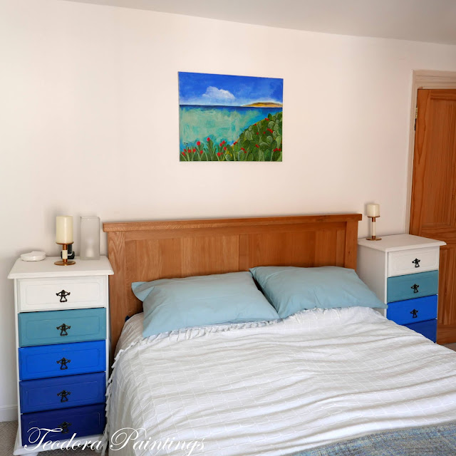The next step was to paint the bedsides from multicolours to blue ombre effect which turned out perfect! Using chalk paint and different shades of blue, I managed to capture the different tones that remind me of the sea and the sky.